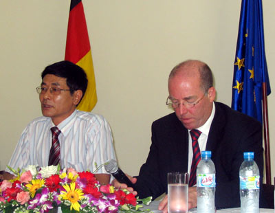 "Ngày càng có nhiều DN Đức coi VN là lựa chọn đầu tư quan trọng", Đại sứ Schulze khẳng định. "VN trong mắt các nhà đầu tư Đức ngày càng hấp dẫn hơn. VN đang trở thành địa chỉ các DN Đức muốn đến". Minh chứng cho xu hướng này, Đại sứ Đức nêu ví dụ về việc kư kết thành lập khu công nghệ Đức tại Hải Pḥng, hay việc xem xét hợp tác công nghiệp đóng tàu và trang bị cảng biển cùng với Vinasin. Cuối 2007, xác định các điểm quan trọng nhất của Dự án ĐH Đức - Việt Hiện nay, trong số 100 ngh́n người VN đang sinh sống và học tập tại Đức, có tới 2.500 sinh viên đang theo học các trường ĐH ở Đức. Tuy nhiên, theo vị tân Đại sứ Đức tại VN, trao đổi sinh viên không phải chỉ có một chiều. Việc xây dựng trường Đại học Đức - Việt đặt ở VN nhằm đạt mục tiêu này. Dự án đang trong quá tŕnh đàm phán. Tuần trước, một phái đoàn VN đă sang Đức để đàm phán thêm về vấn đề này. Đại sứ Đức khẳng định, về mặt chính trị, hai bên đều mong muốn có một trường ĐH như vậy. Đại diện phía VN, người đứng đầu Chính phủ, Thủ tướng Nguyễn Tấn Dũng đă khẳng định như vậy trong buổi tiếp Chủ tịch Hội đồng Liên bang Đức ở thăm VN hồi tháng 9. Đại sứ mong muốn cuối năm 2007, các điểm quan trọng nhất của dự án sẽ được xác định. Ông tin tưởng, sẽ sớm có kết quả cụ thể trong xây dựng một Đại học Đức - Việt ở VN. Hỗ trợ phát triển v́ ḷng tin dành cho VN Bên cạnh lĩnh vực kinh tế - thương mại, giáo dục - đào tạo, hợp tác phát triển là một ưu tiên trong quan hệ song phương Đức - VN. Từ những năm 90 đến nay, sau khi Đức nối lại viện trợ cho VN, Đức đă đầu tư vào VN tới hơn 800 triệu euro, tương đương hơn 1 tỷ USD. Trước câu hỏi của báo giới về việc có hay không việc Đức sẽ rút dần viện trợ phát triển cho VN tới năm 2015, tân Đại sứ khẳng định, thông tin đó hoàn toàn không chính xác. "Không có lí do ǵ để nghĩ đến việc dừng hợp tác phát triển với VN". Hai năm một lần, đại diện hai nước sẽ họp bàn, định ra các dự án phát triển nào sẽ được hai bên hợp tác thực hiện trong 2 năm tiếp theo. Mùa xuân năm 2008, hai nước sẽ tổ chức ṿng đàm phán tiếp theo về các dự án cụ thể sẽ được thực hiện. Hai nước đă xác định, trong hai năm 2008 - 2009, trọng tâm của các dự án phát triển hai nước là y tế, môi trường, và hỗ trợ kinh tế. Phía Đức khẳng định rất lạc quan về sự hợp tác này và chờ các dự án đề xuất từ Chính phủ VN. "Chúng tôi sẵn sàng cùng các bạn thực hiện các dự án đó". Đại sứ Đức nhấn mạnh: "Đức hỗ trợ phát triển cho VN hoàn toàn do ḷng tin đặt vào VN. Đức hỗ trợ bởi tin rằng VN là nơi mà các dự án được thực hiện nghiêm túc, hoàn thành đúng đắn... Đức sẽ tiếp tục theo đuổi chính sách này".