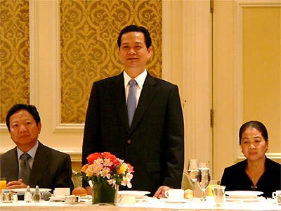 V́ hoàn cảnh chiến tranh, nhiều người phải ra đi, rời khỏi tổ quốc t́m nơi sinh sống. Đồng bào bị ly tán. Nhưng Chính phủ Việt Nam luôn coi bà con kiều bào là một bộ phận không thể tách rời, là nguồn lực to lớn của dân tộc. "Tôi xin khẳng định là người dân trong nước luôn nhớ đến người Việt Nam ở nước ngoài và biết là người Việt xa quê luôn hướng về Tổ quốc. Đảng và Nhà nước luôn quan tâm đến kiều bào", Thủ tướng nói. Sự quan tâm đó, theo Thủ tướng, thể hiện rơ ở những điểm sau: Việt Nam đă thiết lập quan hệ ngoại giao với 174 nước nhằm ba mục tiêu: Tăng cường quan hệ chính trị hữu nghị giữa các nước, thúc đẩy quan hệ kinh tế - thương mại - đầu tư và thứ ba là bảo vệ, chăm lo lợi ích chính đáng của Việt kiều ở các nước đó. Đảng và Nhà nước nỗ lực xây dựng các chính sách theo hướng coi kiều bào cũng như người trong nước, khuyến khích kiều bào về đầu tư trong nước, cho phép bà con được mua nhà. "Đối với những người c̣n khác biệt về quan điểm, mong kiều bào khuyên nhủ họ không nên chống phá mà cùng bắt tay xây dựng đất nước, trở về Việt Nam để chứng kiến sự thay đổi của quê hương", Thủ tướng nhắn nhủ. Người đứng đầu Chính phủ chia sẻ: Biết kiều bào ở nước ngoài có thuận lợi nhưng cũng gặp nhiều khó khăn. Mặc dù vậy, bà con vẫn cố gắng giúp đỡ gia đ́nh, người thân tại Việt Nam. Năm 2006, lượng kiều hối gửi về nước đă là 4,9 tỷ USD. Thủ tướng mong muốn bà con kiều bào đùm bọc, giúp đỡ lẫn nhau làm ăn, nỗ lực cho con em ăn học thành đạt, giữ ǵn văn hóa và tiếng Việt. Nhận định về t́nh h́nh đất nước hiện nay, Thủ tướng nói Việt Nam đang có nhiều thành tựu lớn, chính trị ổn định, vai tṛ quốc tế ngày càng nâng cao. Ông dẫn chứng chuyện hàng loạt tập đoàn lớn của Mỹ đă xin gặp Thủ tướng khi ông sang dự họp Đại hội đồng LHQ. Ông Tony B.Giang, Chủ tịch Maizon Holdings tỏ ra ấn tượng về phong cách của Thủ tướng Nguyễn Tấn Dũng. Ông tự hào "Thủ tướng là người rất hiện đại hóa, c̣n trẻ và có tài. Việt kiều tại Canada rất tán đồng chính sách của Thủ tướng và hướng về quê hương. Tôi về thăm Việt Nam mấy lần và đă chứng kiến sự phát triển của Việt Nam. GDP của Việt Nam tăng trưởng rất nhanh nên tôi quyết tâm về Việt Nam làm ăn".